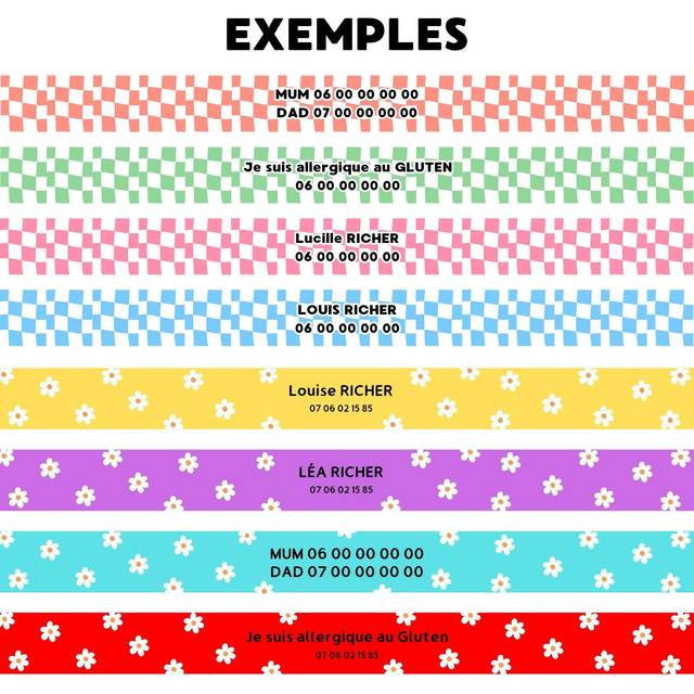 - la personnalisation souhaitée exemples (NOM/PRÉNOM ; NUMÉROS; ALLERGIES)*