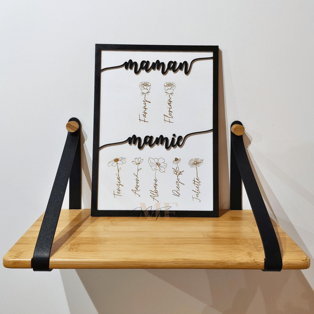 Cadre en bois personnalisé, un cadeau unique pour Maman et Mamie ! Les prénoms des enfants et petits-enfants sont délicatement gravés sur le fond et le contour du cadre, tandis que les mots "Maman" et "Mamie" ressortent en relief pour une touche d'élégance. Un souvenir précieux à chérir pour toujours.