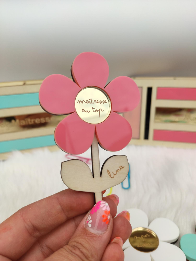Ce magnet allie la chaleur intemporelle du bois à la modernité délicate d'une fleur en plexiglas coloré. Au centre de cette fleur, un mot doux en miroir doré reflète toute l'appréciation que vous portez à leur dévouement. Un cadeau élégant et significatif qui rappellera chaque jour l'impact positif de leur travail.