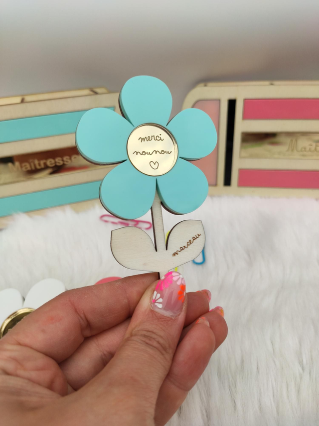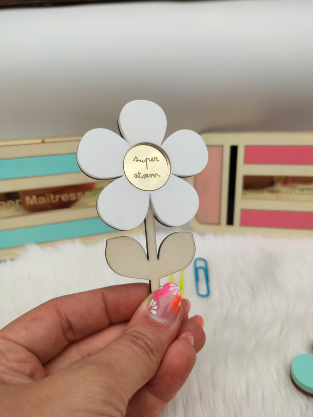 Ce magnet allie la chaleur intemporelle du bois à la modernité délicate d'une fleur en plexiglas coloré. Au centre de cette fleur, un mot doux en miroir doré reflète toute l'appréciation que vous portez à leur dévouement. Un cadeau élégant et significatif qui rappellera chaque jour l'impact positif de leur travail.