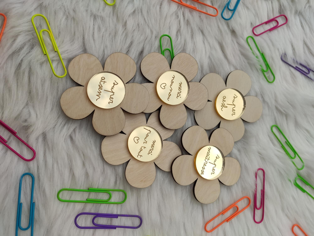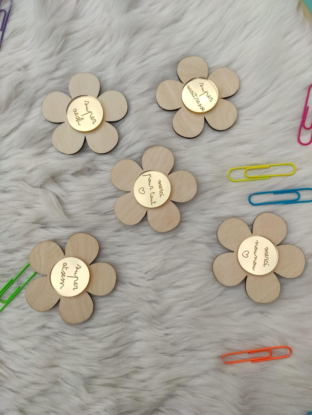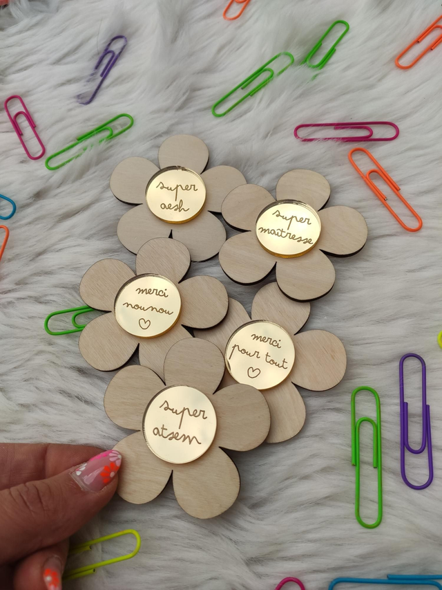 Offrez un remerciement unique avec notre charmant magnet en bois en forme de fleur. Son cœur miroir doré reflète la lumière et symbolise les doux souvenirs partagés. Gravé d'un message de gratitude, c'est le cadeau parfait pour dire merci à une maîtresse, une ATSEM, une nounou ou une AESH qui a semé le bonheur tout au long de l'année. Un souvenir précieux et durable pour une personne exceptionnelle !