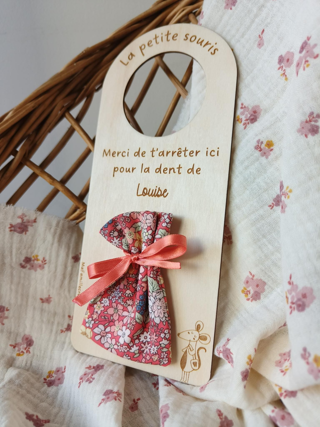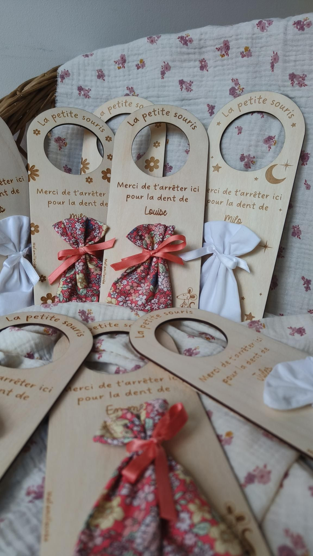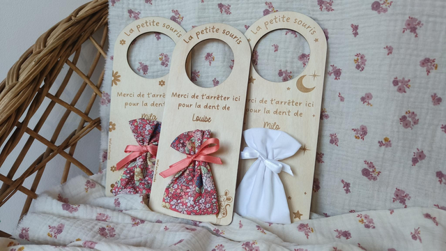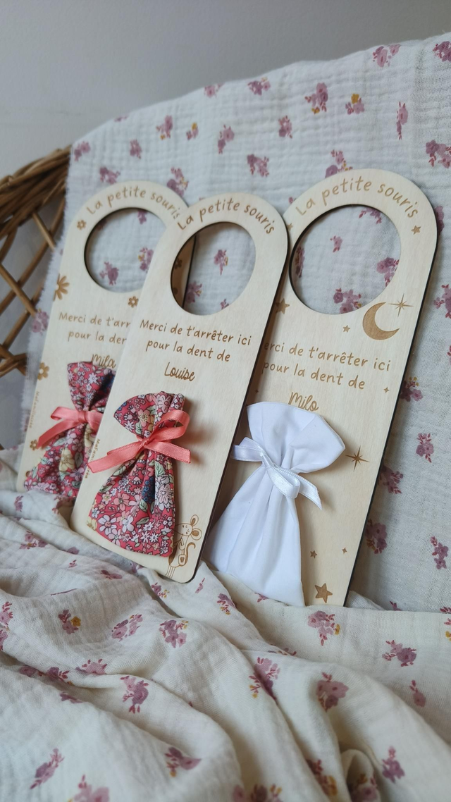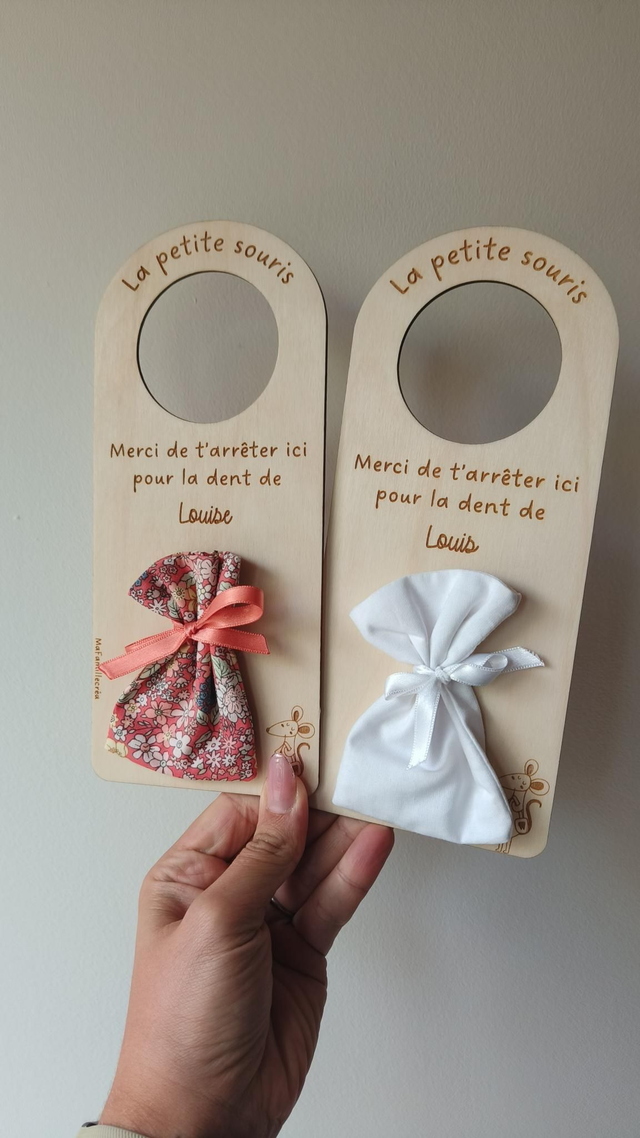 Rendez le passage de la petite souris encore plus magique avec cette pancarte unique à accrocher à la poignée de porte. Fini la recherche sous l'oreiller ! Glissez délicatement la précieuse dent de lait dans la petite poche prévue à cet effet. La pancarte, discrète et élégante, sera un signal clair pour la petite souris qui pourra procéder à l'échange sans déranger le sommeil de votre enfant. C'est l'accessoire idéal pour préserver la magie des moments d'enfance.