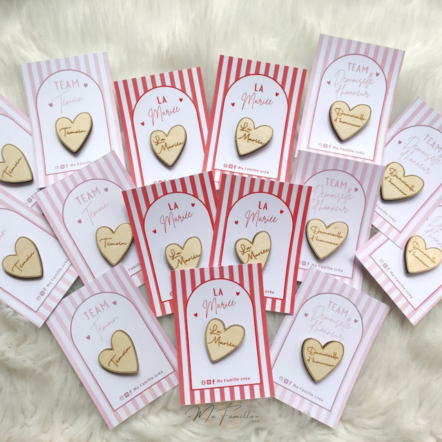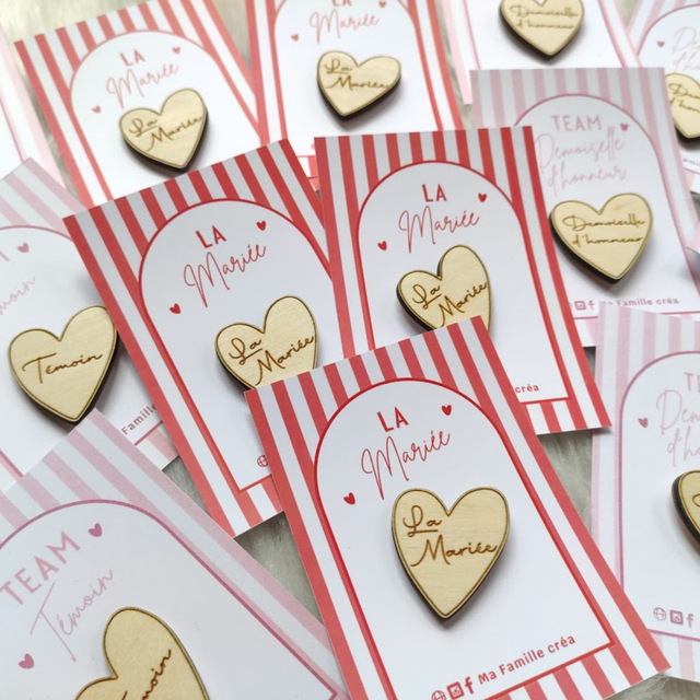 Craquez pour notre pin's en bois "La Mariée" ! C'est le petit détail parfait pour célébrer l'approche du grand jour. À porter sur un pull, une veste en jean ou un sac, il annonce avec délicatesse la bonne nouvelle et ajoute une touche de charme naturel à toutes vos tenues de préparation de mariage. Une façon adorable de montrer votre joie !