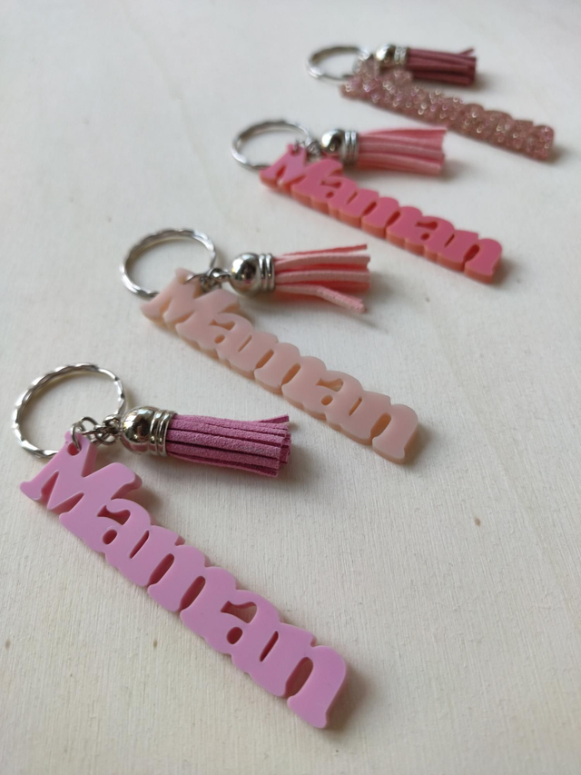 Porte-clés MAMAN en plexiglass avec son petit pompon de couleur.