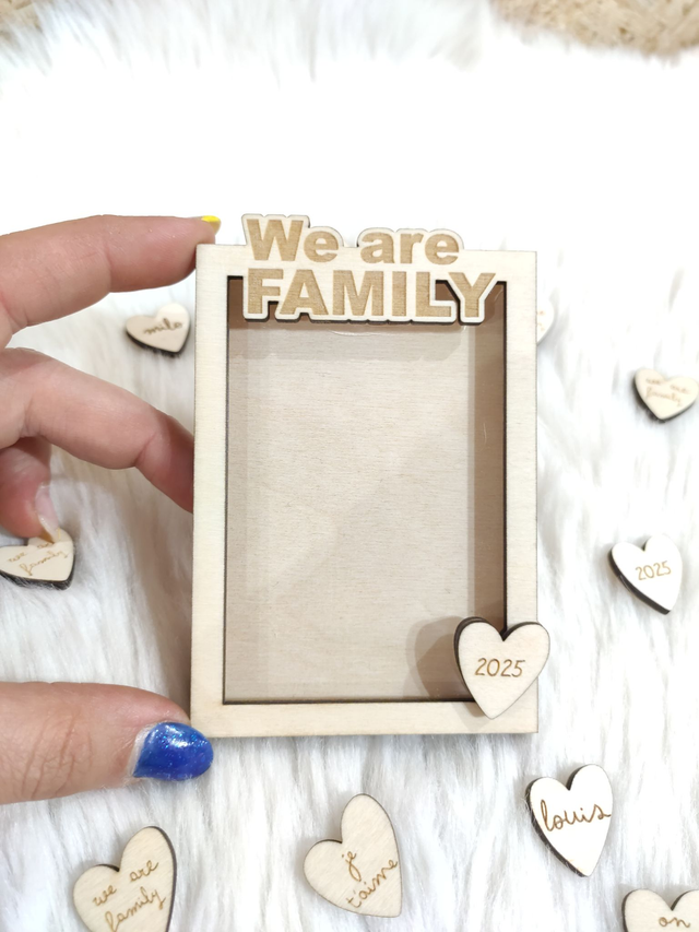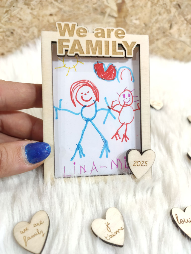Offrez un cadeau qui capture l'essence de l'amour familial avec notre cadre en bois aimanté "WE ARE FAMILY", spécialement conçu pour accueillir un précieux souvenir. Idéal pour y glisser un dessin d'enfant ou une photo (format 6x9 cm). Petit +, personnalisez ce cadre avec le/les prénoms de vos enfants ou petit mot d'amour gravés sur le cœur.